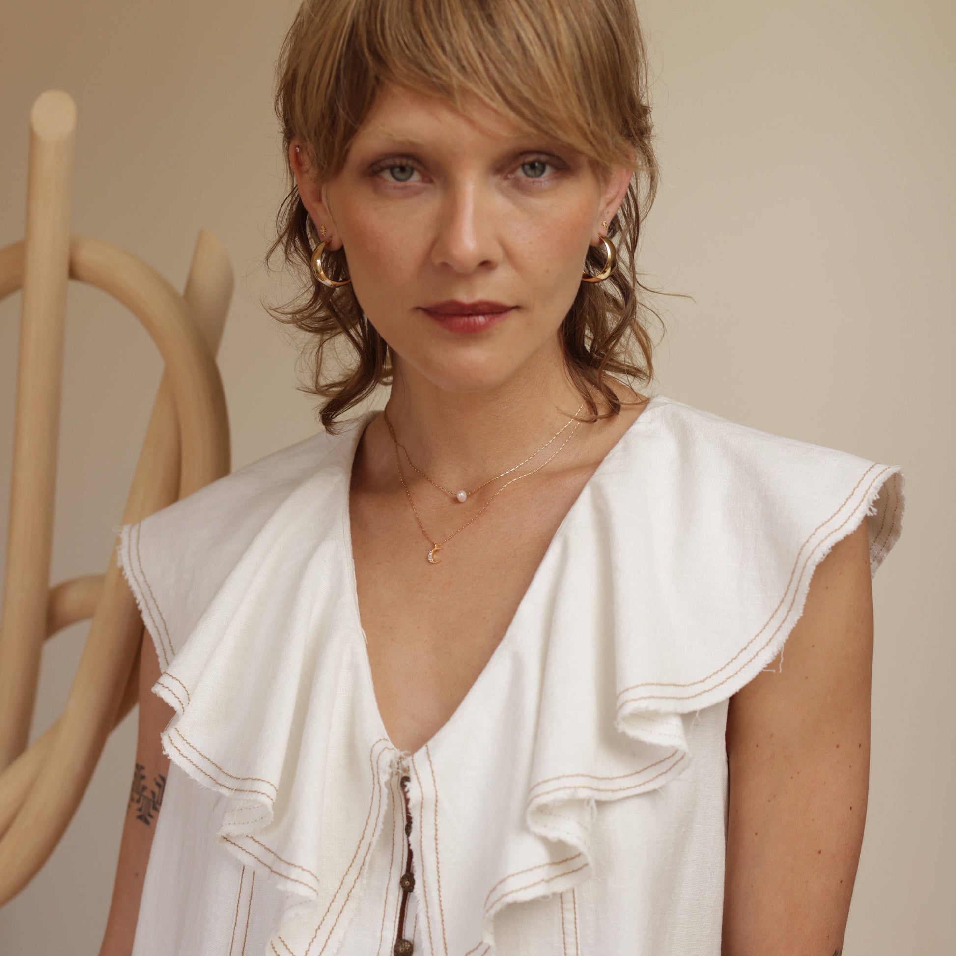 A delicate crescent moon charm set with three sparkling crystals hangs from 16" chain with a 2" extender. The chain is 14k gold plated brass + coated to resist tarnish and create a hypoallergenic surface. Charm measures just under 1/2". Designed and assembled in Sonoma, California.