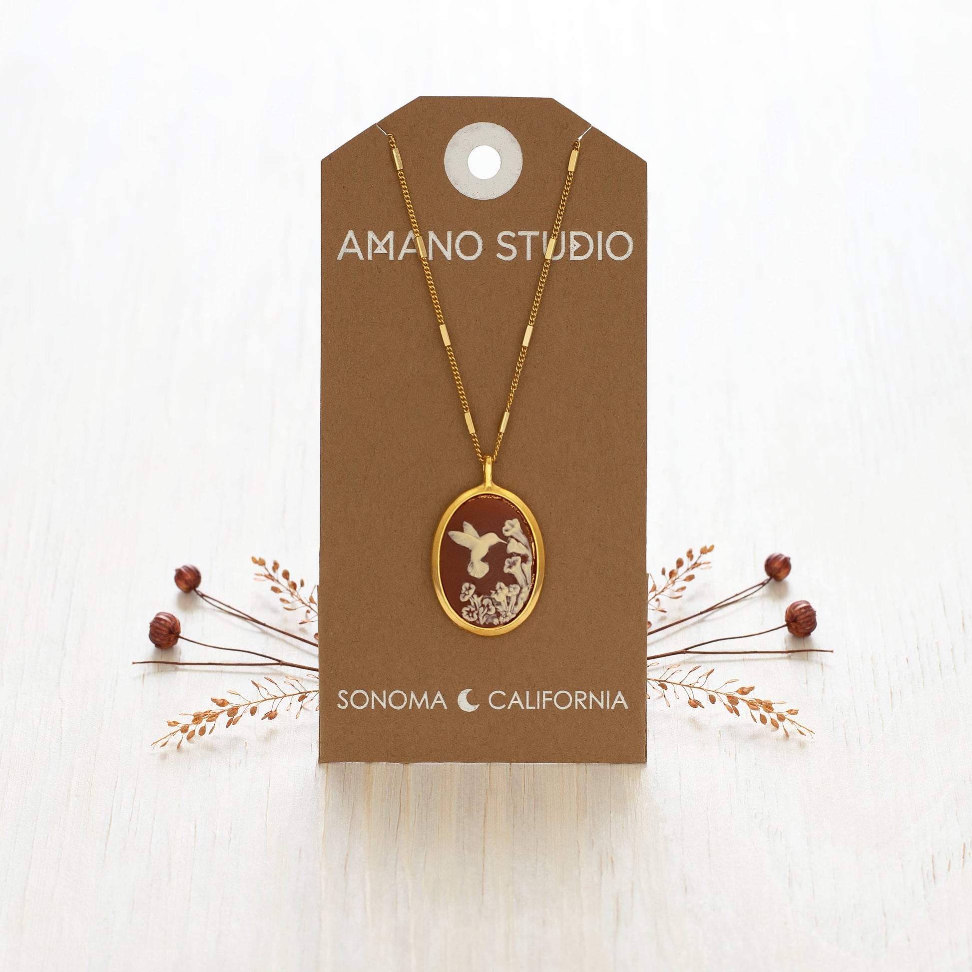 Amano Studio's new collection of vintage German Cameos is their first foray into the Dark Academia trend. The hummingbird is a gardener's delight, but also traditionally represents a messenger from the spiritual world. Cameo is made of cast resin, set in a bezel of 14k gold plated brass. 18" + 2" extender vintage style bar chain is made of 14k gold plated brass + coated to prevent tarnish.